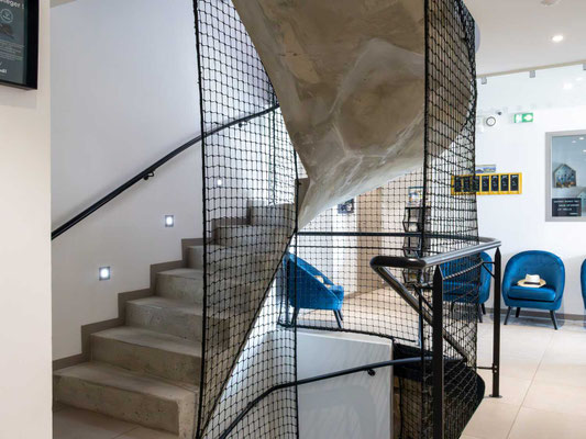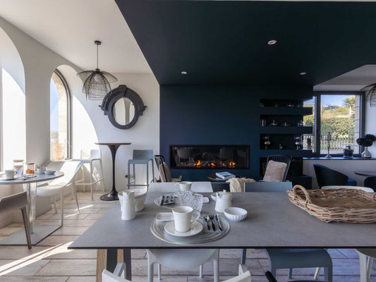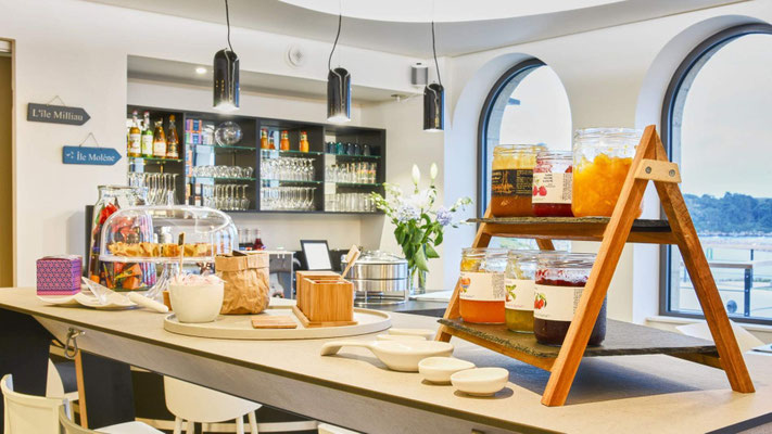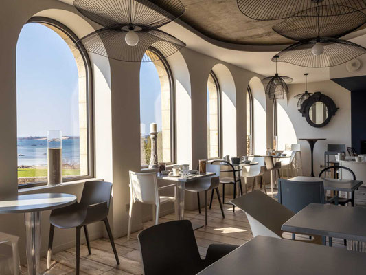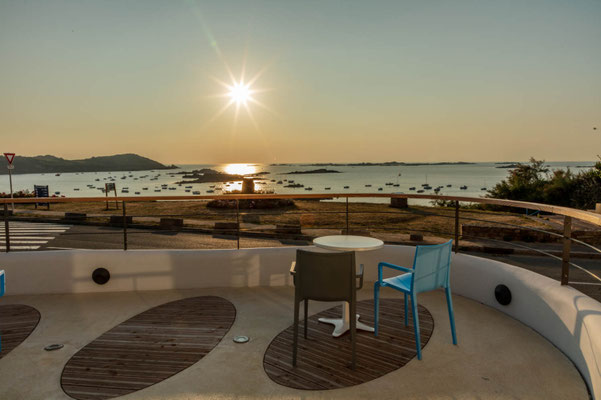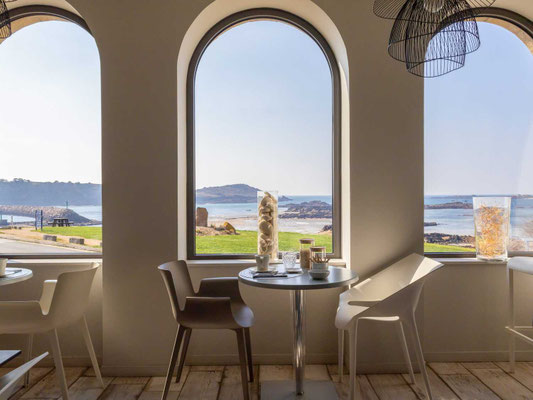 Mit seinen 20 hellen und liebevoll gestalteten Zimmern, alle mit Blick auf das Meer, lädt das Haus zum Zurücklehnen und Wohlfühlen ein. Sieben dieser Zimmer verfügen über einen eigenen Balkon oder eine kleine Terrasse, auf der man fast schon über dem Sand. Jeder Raum ist einzigartig – benannt nach den Ausblicken, die er bietet, etwa auf die Île Milliau, Molène, die Pointe de Lan Kerellec oder die Halbinsel Castel. Die Ausstattung im zeitgemäß maritimen Stil sorgt für totale Entspannung.