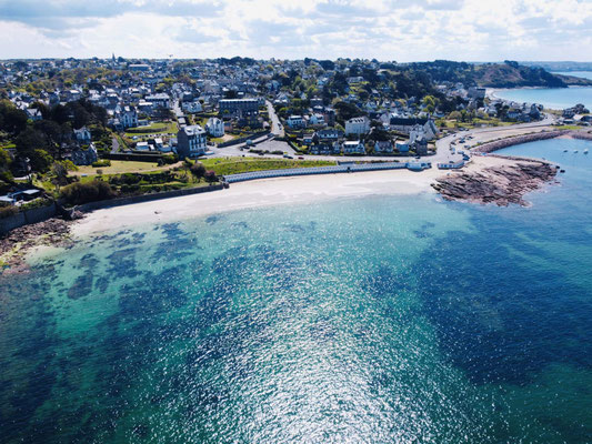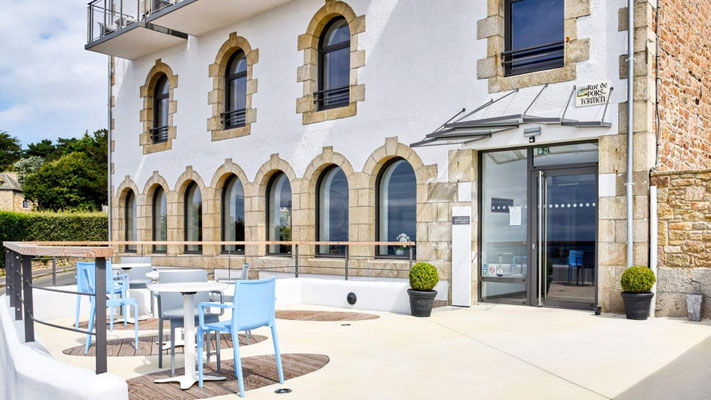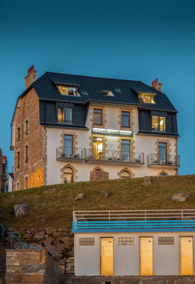 Am ruhigen Strand von Pors Termen in Trébeurden, eingerahmt von den spektakulären Felsen der rosa Granitküste, erhebt sich das bezaubernde Hôtel Le Pavillon de la Plage in einem Belle‑Époque‑Gebäude aus dem Jahr 1919.